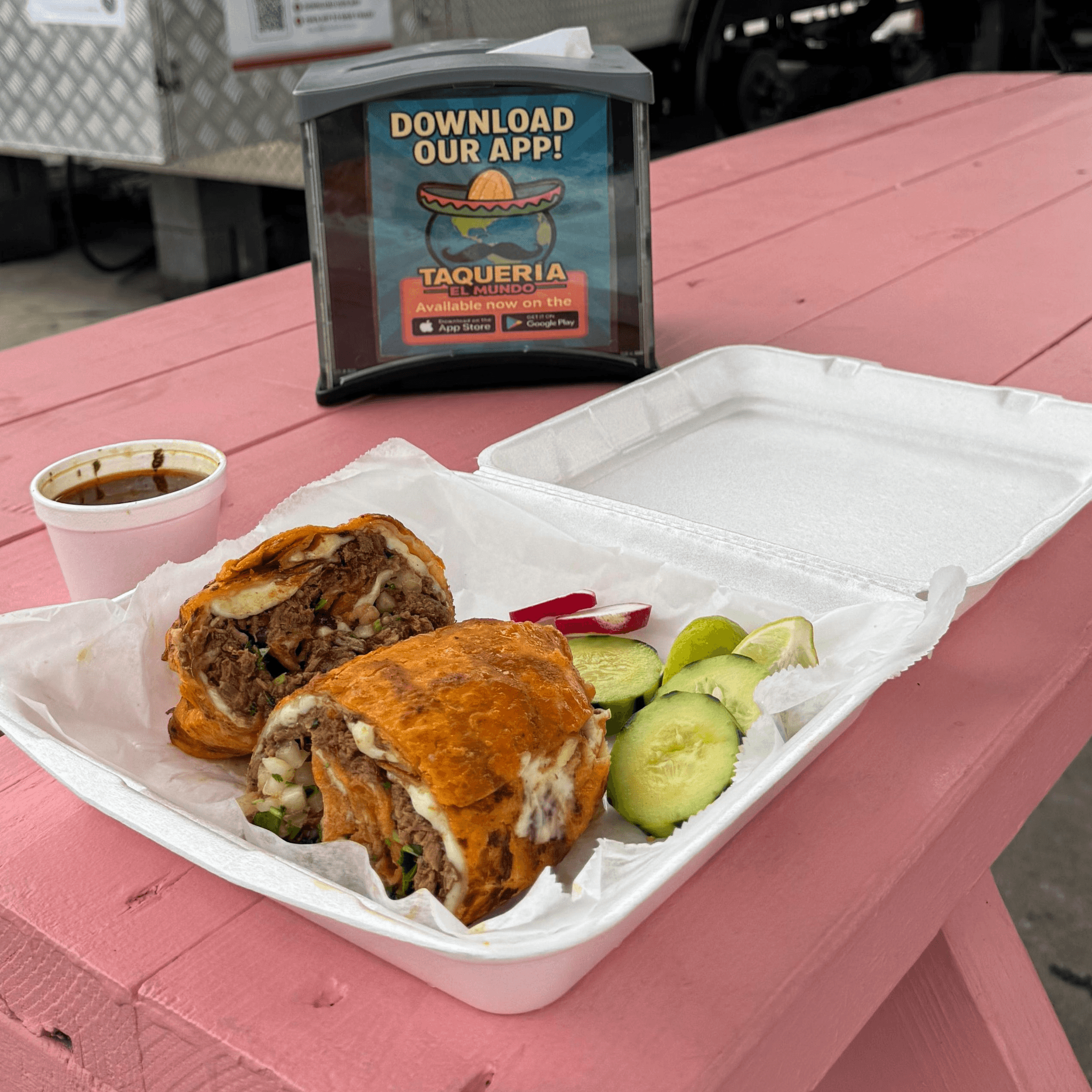 Delicious birria meat and mozzarella cheese inside a crispy flour tortillas, served with vegetables on the side. Perfect for sharing!!